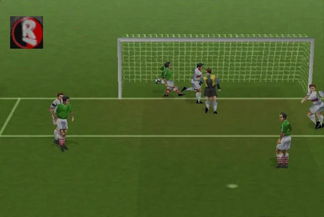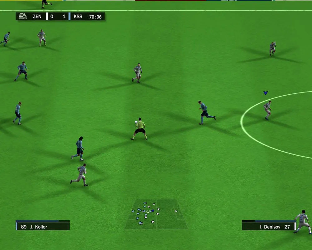 К неказистой внешности игроков мы прибавим еще известные проблемы с интеллектом. Искусственным, конечно, не моим. Очевидно, что за столько лет компьютерный думатель впал в глубочайший маразм. Вот представьте, вы — футболист. Ваша главное желание — какое? Потрогать мяч, конечно же (гипотетически; зная сколько зарабатывают футболисты, моим главным желанием было бы попасть куда-нибудь в Реал или Арсенал). А что вы будете делать, если он упадет рядом с вами, а противника поблизости нет? Ответ, думаю, очевиден для всех… кроме ИИ игры. По старой, давно сложившейся традиции к мячу бегает только тот игрок, который отмечен стрелочкой (кружочком, финтифлюшкой — какая разница?). Остальные тупо стоят, как бараны, поворачивая корпус в сторону «колобка». Самое забавное тут то, что ИИ сам выбирает, какого игрока отдать нам в распоряжение. Казусы случаются постоянно — опекаешь противника, а тут бац — переключили. Потерянный игрок побежал по своим делам, выполнять приказы маразматика-ИИ. Еще веселее бывает в защите — бежишь наперерез, но тут ИИ отбирает контроль, а дает кого-нибудь от мяча далекого. Следом выход один на один, гол… сразу пять игроков обеих команд случайно проиграли одинаковую анимацию. Синхронно. Ну точно же, такое я видел еще в Корейско-Японской «Фифе».