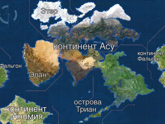 Континент Асу омывается с запада морем Арго, с севера - морем Пионеров, с востока - Великим Восточным океаном и морем Азурии, с юга - морем Бенигника. В континент входит цепь островов Триан. На западной части располагается плодородное плато Элан, отгороженное от всего остального континента цепью гор Ашур, которое на севере заканчивается полуостровом Сидон. Северо-западная часть Асу представлена островом Бекар и заснеженной равниной Этер, над которой на специальной платформе построен один из наших космопортов. Сеттова пустыня и вулканическая местность Калдерон вкупе с горами Васа являются одной из самых бесплодных территорий Асу. Возвышенность Чиллей и полуостров Биберон, пожалуй, единственные геодезические достопримечательности центральной части континента…
