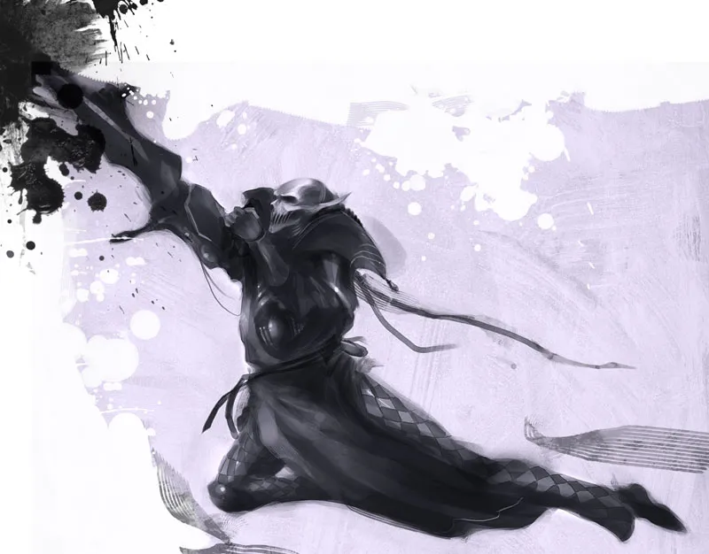 На секунду его не стало видно под горой прислужников Слаанеш, но он с криком взлетел над их головами и развернулся в полёте, чтобы приземлиться к ним лицом. Когда они развернулись, он снова прыгнул: двое из них упали, когда он их коснулся, и ещё пятеро схватили лишь воздух, когда он вновь кувыркнулся по сцене.
