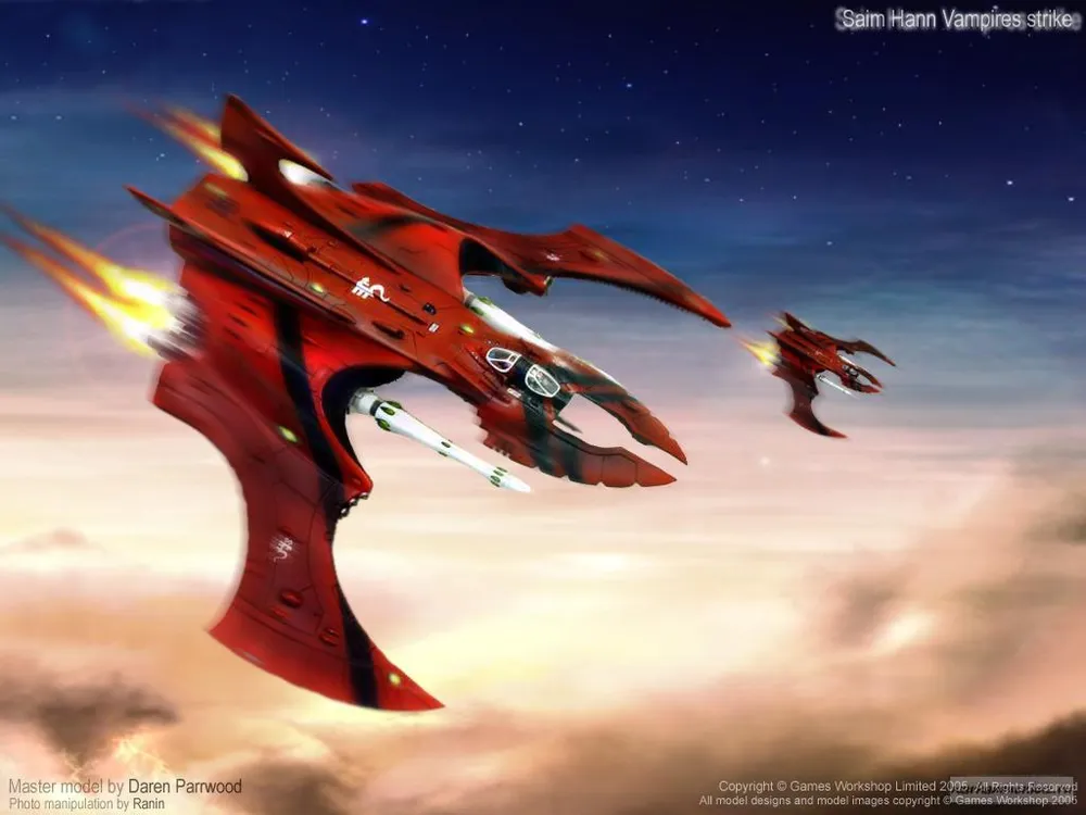 Небеса над полем боя — крайне важная сторона войны. Тот, кто выигрывает войну в небе, имеет преимущество в наземной. Эльдар это поняли давно, и их превосходная авиация даёт им заметную фору в любом воздушном конфликте. «Вампир» — самый крупный самолёт эльдар. Это штурмтранспорт, используемый для доставки войск с орбиты на землю. Им обычно пользуются банды корсаров эльдар, но и силы миров-ковчегов нашли ему применение, аналогичное применению космодесантниками «Громовых ястребов».