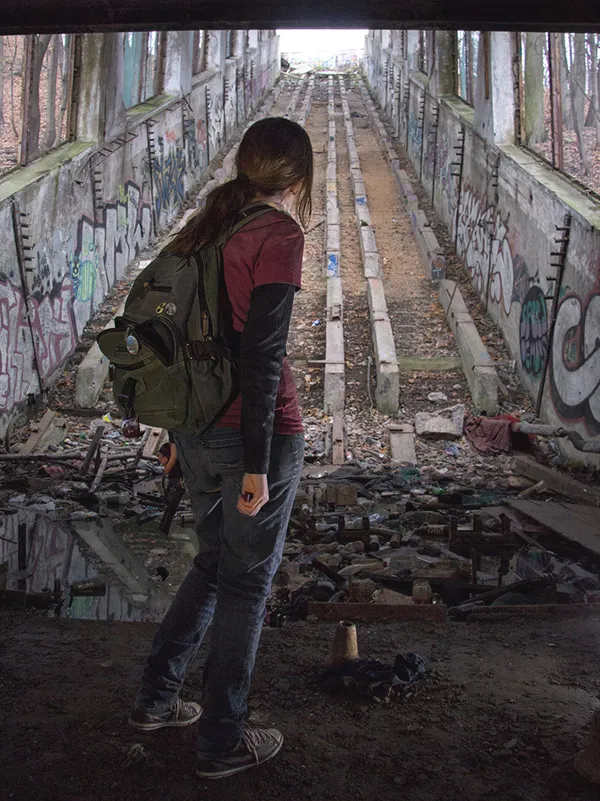 Валерий Корнеев: Только не пишите «фотограф»: я второй, что ли, раз в жизни пытаюсь фотографировать косплей в каких-то специально придуманных условиях; кругом полно людей, которые делают это куда профессиональнее. Мне было интересно сделать именно сюжет про Элли — Оля познакомилась с игрой с моей подачи, я с большим трепетом отношусь к руине эскалатора на Воробьевых горах, ну и само собой вышло, что мы там нарисовались с камерой, светом, игрушечным пистолетом и футболкой, пахнущей голубикой. Про голубику не фигура речи: в городе оказалось невозможно найти футболку нужного цвета, поэтому мы сделали принт на ярко-красной и состарили ее, выстирав несколько раз в растворе соды, соли и первого подвернувшегося под руку красителя — ягодного сиропа из IKEA. Надо было, конечно, ответственнее подойти к подбору оружия, раздобыть макет винтовки, как в игре, но пришлось спешить: мы боялись, что погода испортится, всё завалит снегом, и плакала тогда наша съемка.