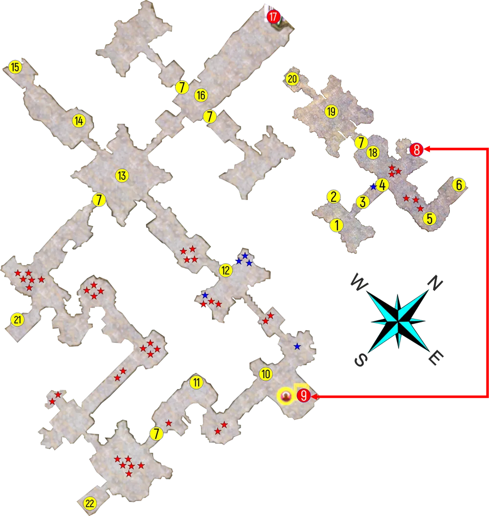 1 – место воскрешения. 2 – скелет (странный ключ). 3 – дверь (открывается ключом, который дал Корен). 4 – дверь (открывается странным ключом). 5 – тело Джероно. 6 – алтарь Синего эмбера. 7 – запертая дверь. 8 – переход на верхний ярус. 9 – переход на нижний ярус. 10 – Стефан. 11 – зомби. 12 – спальник. 13 – древний том. 14 – мертвый гоблин. 15 – алтарь Белого эмбера. 16 – королева пауков. 17 – выход из гробницы. 18 – место появления из Сияния. 19 – Фиа. 20 – фонарь. 21 – алтарь Зеленого эмбера. 22 – алтарь Красного эмбера. Звезды: красные – враги, синие – контейнеры.