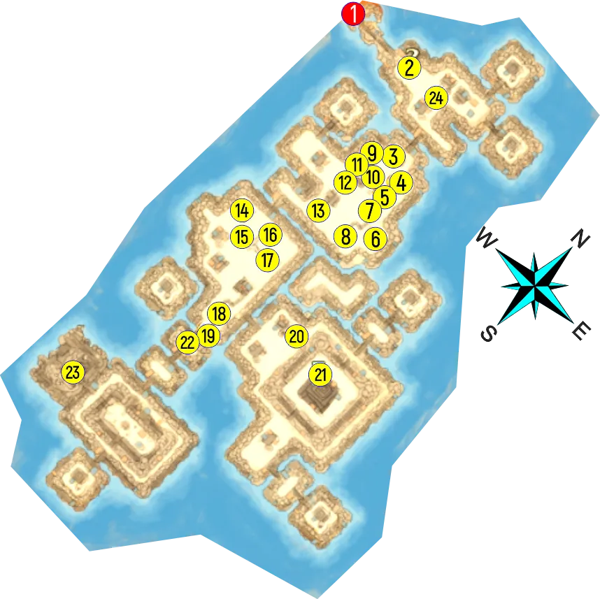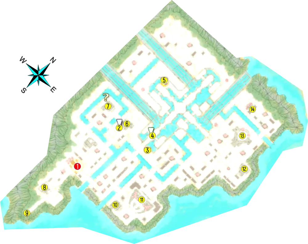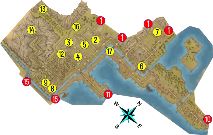 1 – переход в Угодья. 2 – архонт Флорен. 3 – портниха Эзра. 4 – плотник Скаро. 5 – торговка рыбой Ланса. 6 – кожевник Овин. 7 – Эмелин и Танга. 8 – Симона и Лиф. 9 – торговка мясом Пени. 10 – бакалейщик Йолон. 11 – кузнец Адриэль. 12 – аптекарь Шима. 13 – бакалейщик Маэль. 14 – Аноки и Оля. 15 – бакалейщица Вера. 16 – Айрис и Болин. 17 – запертый дом. 18 – лесник Нил и Лилиана. 19 – торговец рунами Армин. 20 – ткацкий станок. 21 – королевская башня. 22 – стражник Бастилии. 23 – вход в Бастилию. 24 – Кэйлен и Косуми.