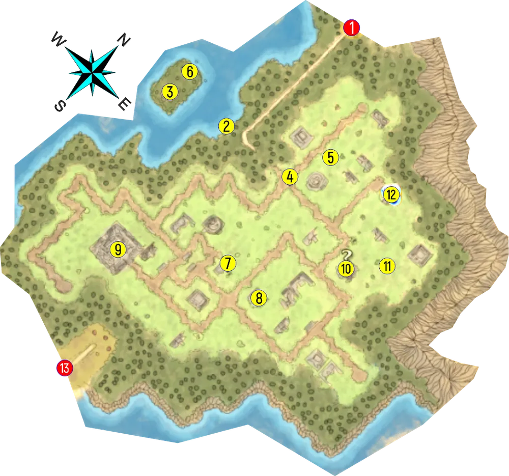 1 – переход в Северный лес. 2 – лодка. 3 – Марвал-отшельник. 4 – Ольда Киан. 5 – Уррег. 6 – могила Старика Маркуса. 7 – Ульмар. 8 – торговец Такода. 9 – Заповедник. 10 – Гопала. 11 – зверюга. 12 – мастерская (наковальня, кожевенный и ткацкий станки). 13 – переход в Угодья.