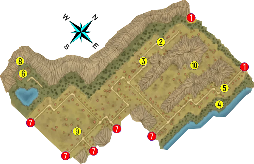 1 – переход в Северный лес. 2 – умирающий почтальон. 3 – засада (при первом посещении этого места на вас нападут три волка). 4 – Адахи. 5 – Бенедикт (заманит в ловушку, подготовленную разбойниками). 6 – Яблонево. 7 – переход в Угодья. 8 – пещера. 9 – лагерь гоблинов. 10 – таинственная дверь.