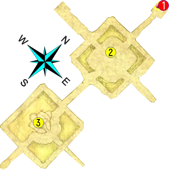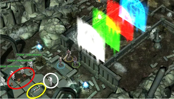 Перед барьерами стоит стол с четырьмя светильниками (обведен желтым овалом), из которых исходит пламя разного цвета. У стола стоят четыре статуи осветленных с жаровнями под ногами (обведены красным овалом). Со статуями можно поговорить и получить от них намеки на то, светильники какого цвета класть в жаровню. Если вы поместите в жаровню не тот светильник, оживет дух осветленного (обведен белой окружностью) и нападет на вас. Имейте в виду, что это очень мощный и грозный соперник. Правильная последовательность помещения светильников в жаровни следующая (слева направо): белый, голубой, зеленый красный.