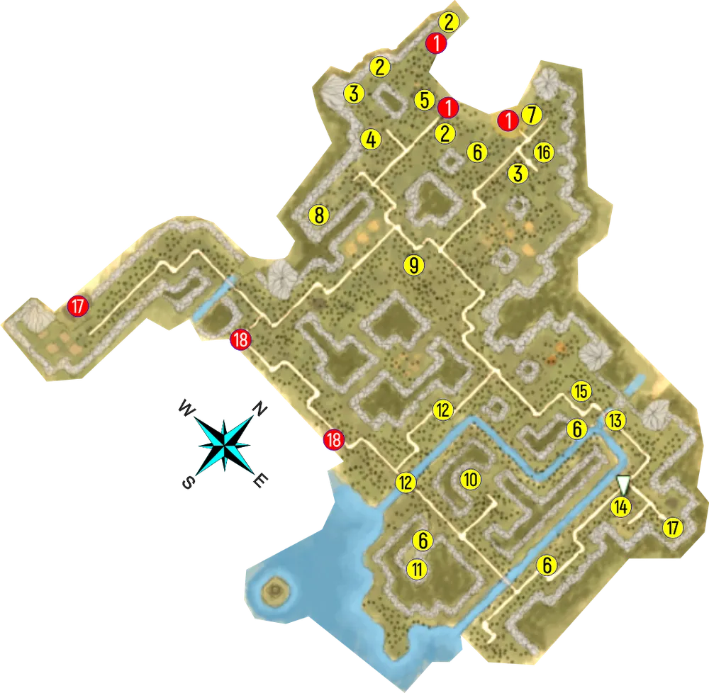 1 – переход в Южный лес. 2 – трактир “Крестьянский очаг” (на втором этаже коробейник с хорошими товарами). 3 – дом Эмилин. 4 – дом портнихи Мадлен. 5 – конюшня. 6 – жилище Ровены. 7 – дом Джейн. 8 – дом кожевника Гарольда. 9 – дом плотника Эдварда. 10 – переход в Пастушьи равнины. 11 – переход в Предел. 12 – дом Уилла. 13 – пещера умертвий. 14 – паучья пещера. 15 – переход в Светлоград. 16 – лагерь гоблинов-налетчиков. 17 – Хорас.