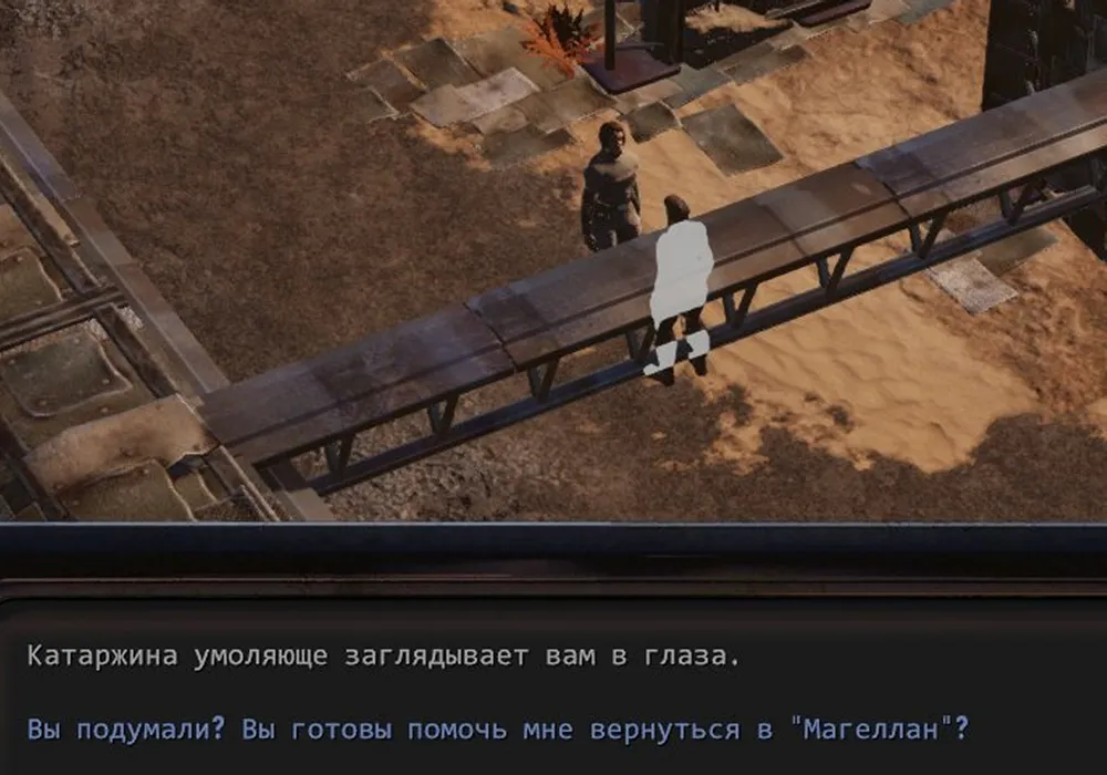 Двинемся в Трущобы пригорода. Прямо на входе нас встретят просьбой проводить в «Магеллан»; почему бы и нет. (Правда, Катаржина почему-то тщательно скрывается от персонала; вероятно, у доброты героя будут последствия.)