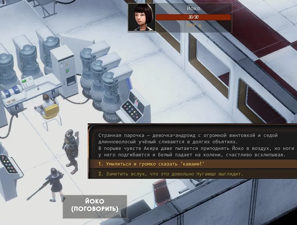А в местной забегаловке назревает конфликт между оранжевым и тремя чёрными. Чью сторону принять? Если преступника (тем более, что чёрные, кажется, сами виноваты), то будет шанс заполучить спутника; мне не удалось; «Лидерство» не было развито до «Расширения отряда».