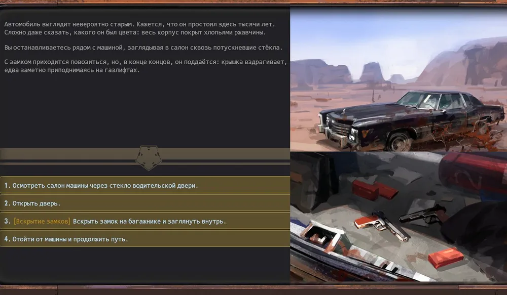 Если у вас нет способности «Вскрытие замков», то, найдя автомобиль, вы останетесь без припрятанного в нём снаряжения: эта локация не отображается подобно «Скелету в бронежилете», все действия – не реальные, а текстовые.