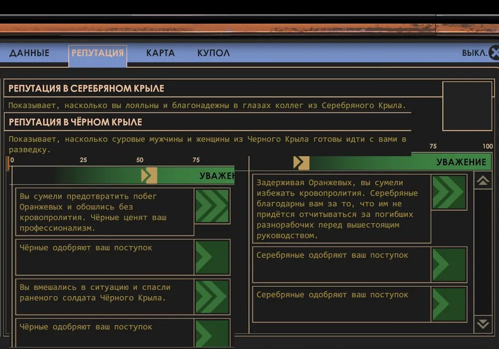 А вот охота за готовящими побег заключёнными прошла по-другому: герою удалось вырвать пистолет из рук Далии, её напарник сдался, герой получил повышение репутации сразу в двух крыльях. Неплохо! (Правда, особого эффекта от высокой или низкой репутации всё ещё не видно.)