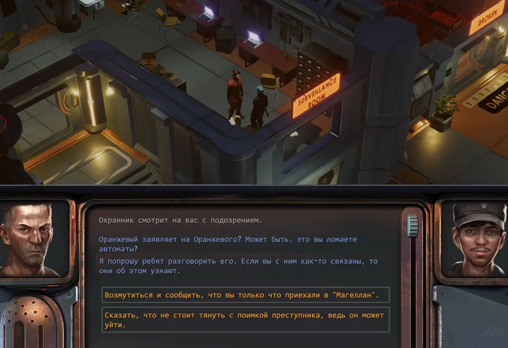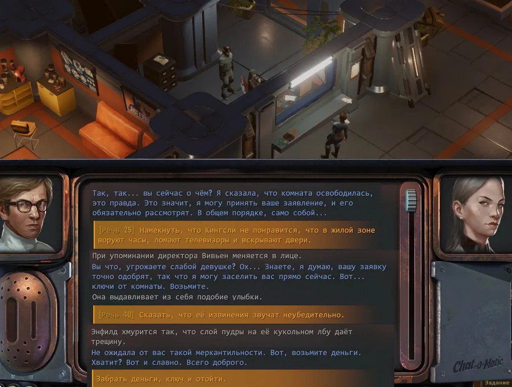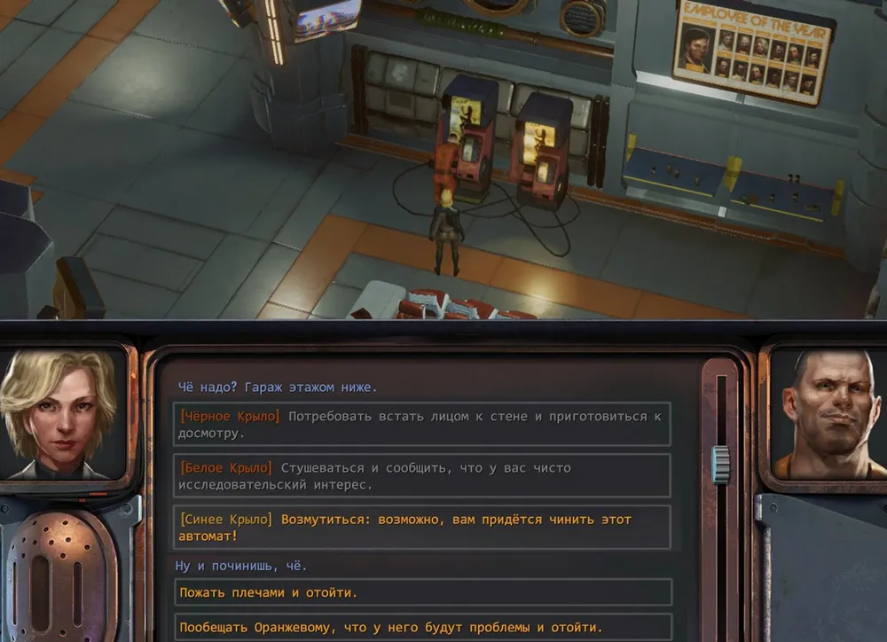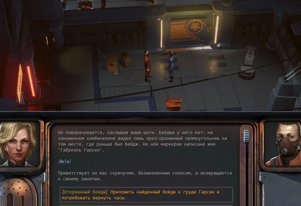 Совершенно неожиданно и быстро был решён квест с украденными часами: нужно было подобрать с пола в комнате бейдж и предъявить его уборщику на административном этаже.