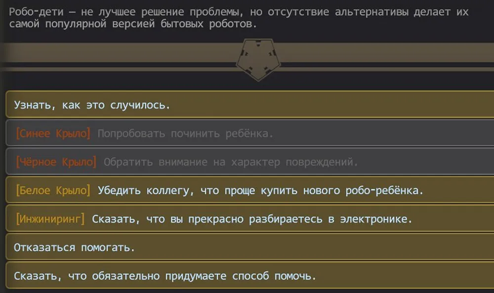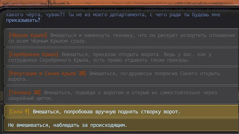Господа геймдизайнеры, вот что это было? Почему в других ситуациях какой-то из показателей влияет на возможность решения квеста (сила, ловкость, и т.д.), а в данном случае это невозможно? Всё отдано генератору случайных чисел? Пусть так, но он обязан менять финалы данной ситуации в зависимости от «загрузок» игры! Крайне неприятно!