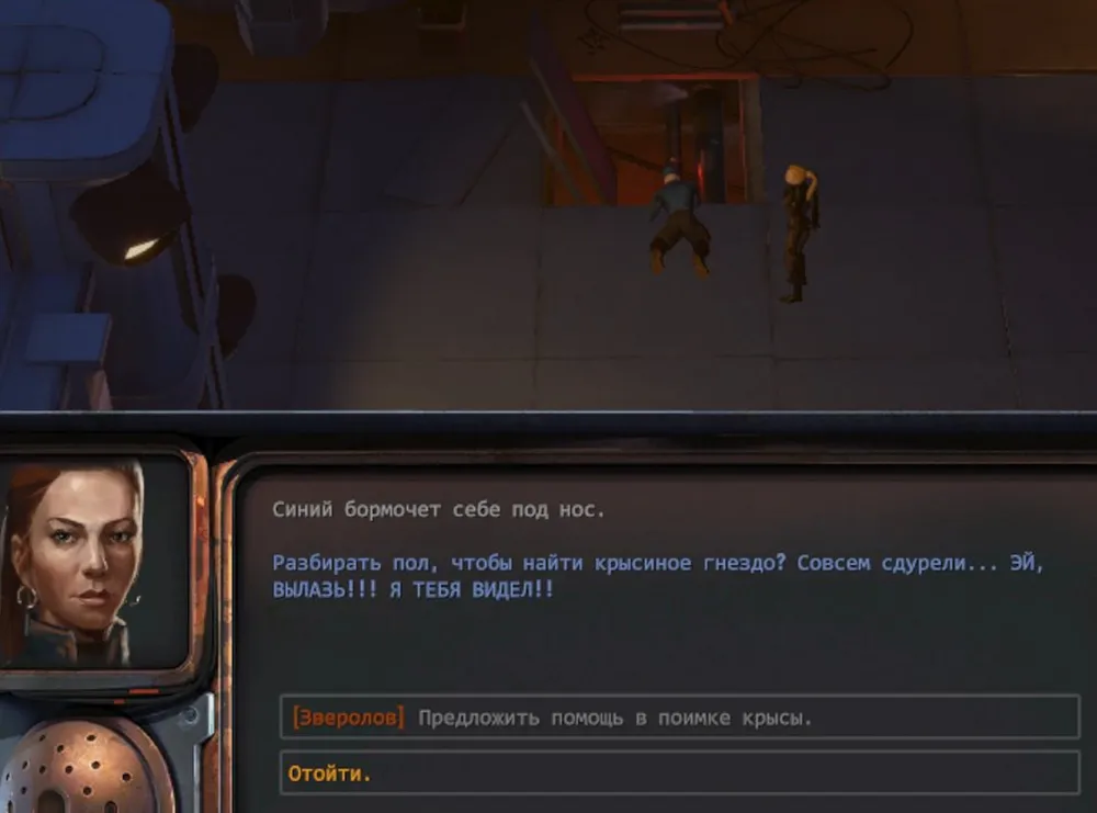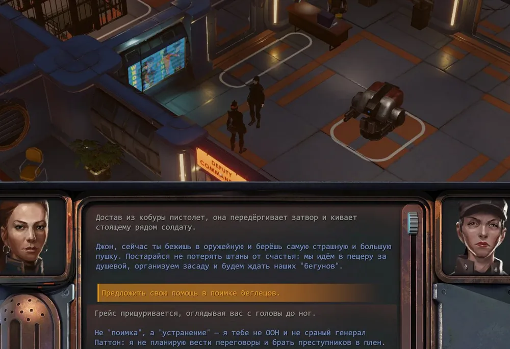 Вернёмся к разговору «оранжевых»: по площадке у единственного магазина в центре зала расхаживает Стефан Моро; можно «сдать» ему заключённых. Есть и другой путь: на противоположном выходе с площадки стоит Ойя Расмуссен, она просить вернуть заключённых к работе (получите больше опыта).