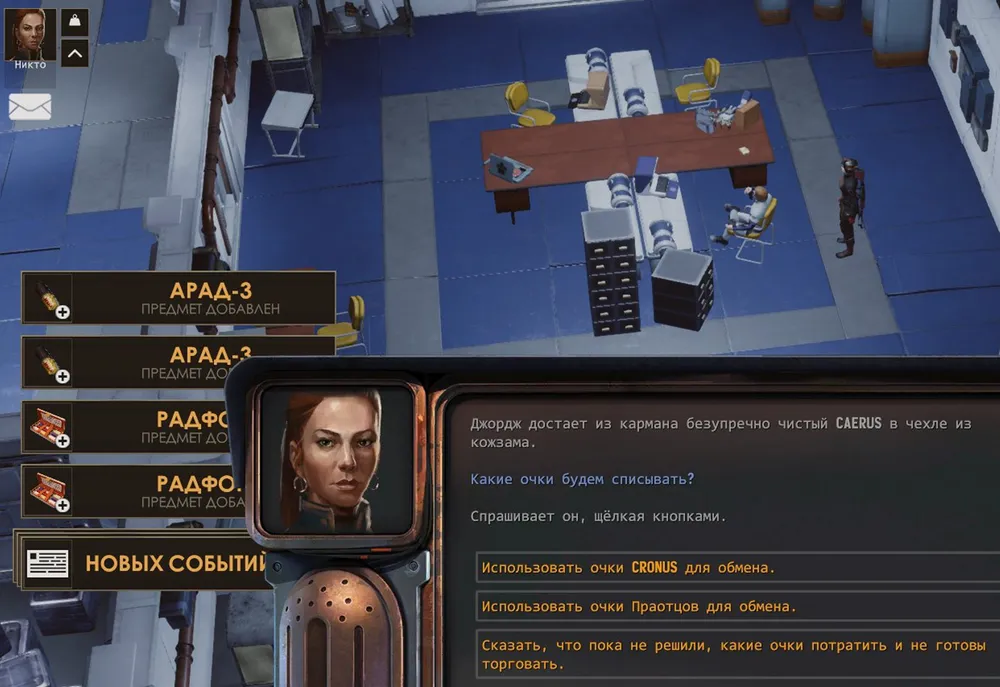 Неподалёку от этой пары сидит в кресле Джордж Зариньш, крайне полезный персонаж. Помните про очки опыта, зарабатываемые героем при сканировании? Он обменяет их на нужные предметы (тем более важные, что купить их негде!): медкомплекты, средства защиты от радиации.