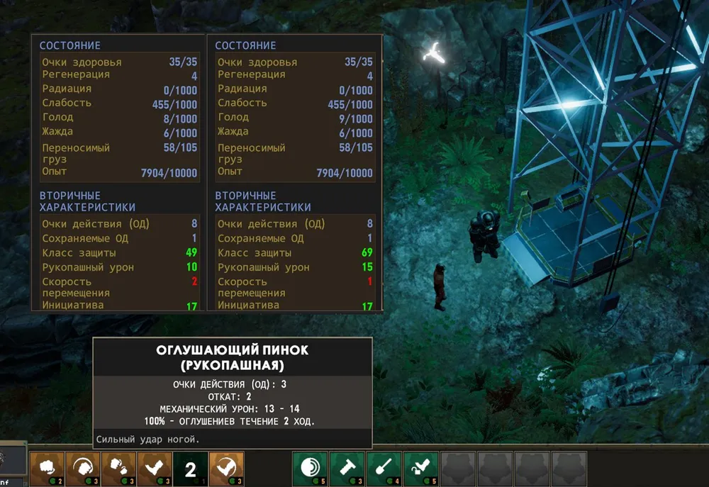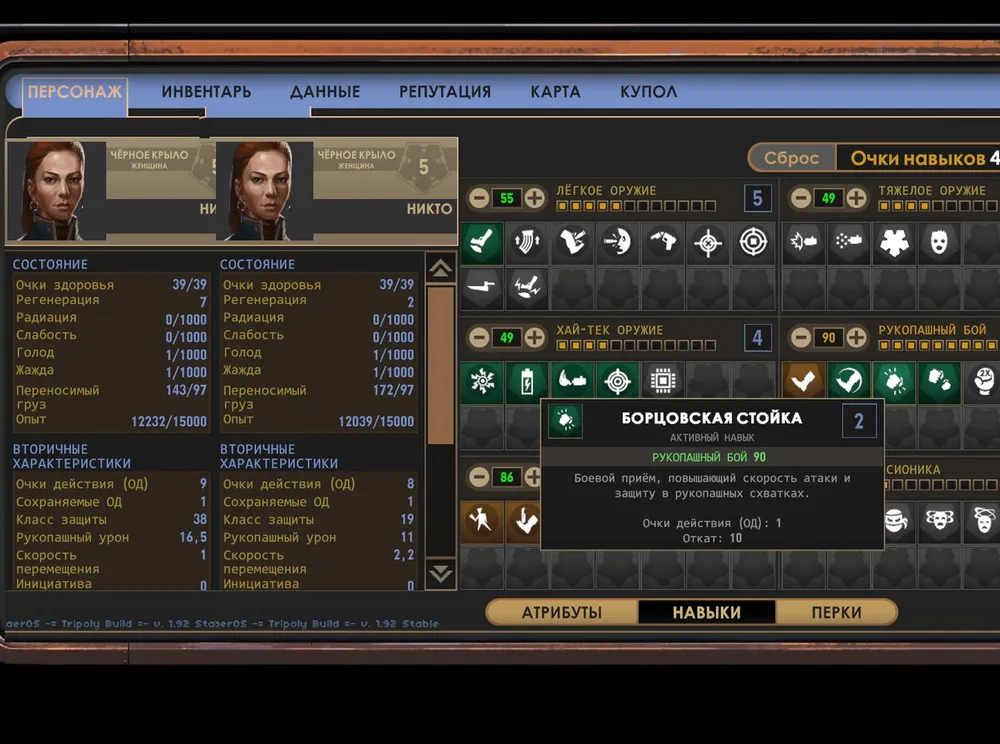То есть, доводим «Рукопашный бой» до девяносто единиц, применяем «Борцовскую стойку», оглушаем врага ударом ноги и… добиваем заточкой или дубинкой? А смысл? Максимальный урон холодного оружия 20-29, а пустой руки 27-29 (без усиления!), с усилением 38-40. То есть, затратив три очка действия, врага можно убить одним ударом кулака.
