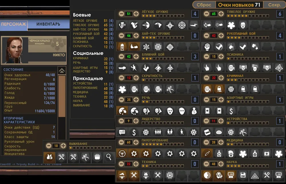 Хай-тек оружие, псионика, медицина, техника, наука, речь, выживание. Одна из важных характеристик, от неё зависит уровень «Науки» и, соответственно, уровень получаемого опыта (наше всё!).