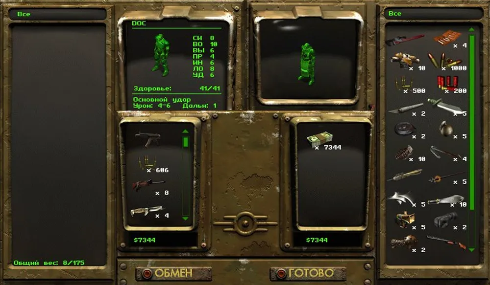 Торговцы как сидят на местах, так и путешествуют по всей карте; у них мало или даже совсем нет «золота»; возможен натуральный обмен; оружие и предметы снаряжения не привязаны к своим местам… Ба! Да это же схема «Fallout 2», верно? Во всяком случае, очень похоже. Но есть и ряд отличий…