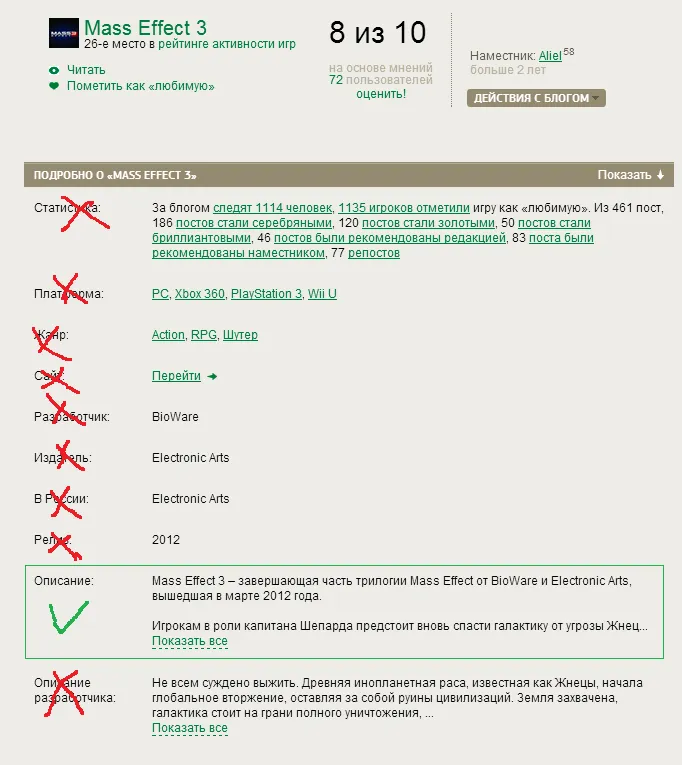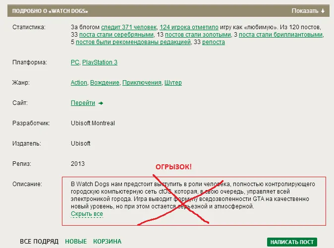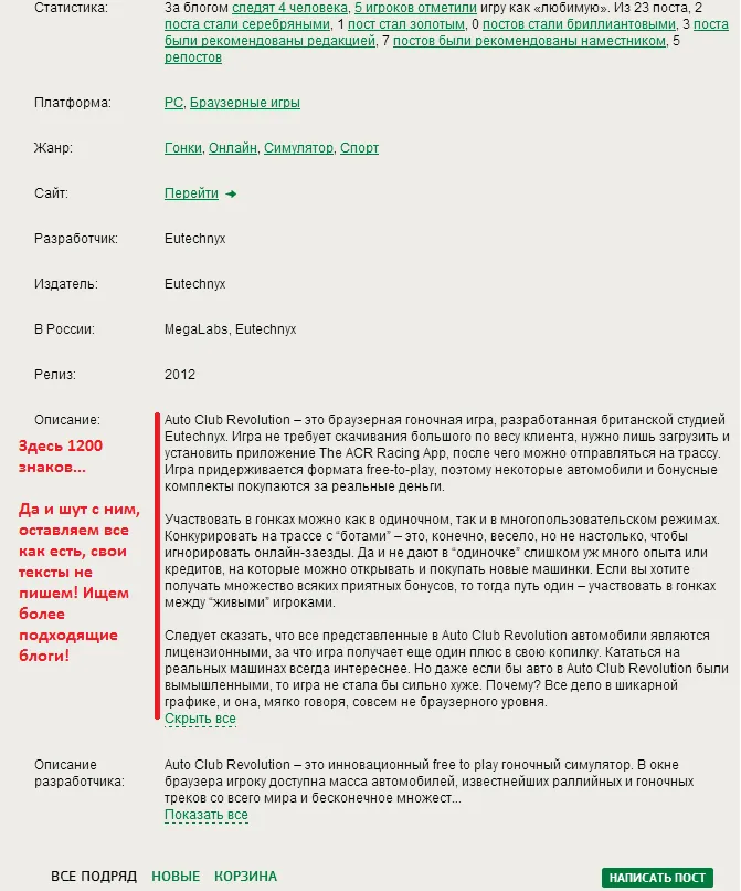 Выбрав приглянувшийся блог, вы увидите информационную карточку. Помимо пунктов а-ля «издатель», «разработчик», «жанр» и т.д, вы наверняка найдете и следующие графы: «Описание» и «Описание разработчика». Описание от разработчиков, если оно фигурирует в карте, игнорируем повсеместно и всегда (впрочем, как и все остальное). В данном случае нас интересует лишь графа «Описание», и только она!