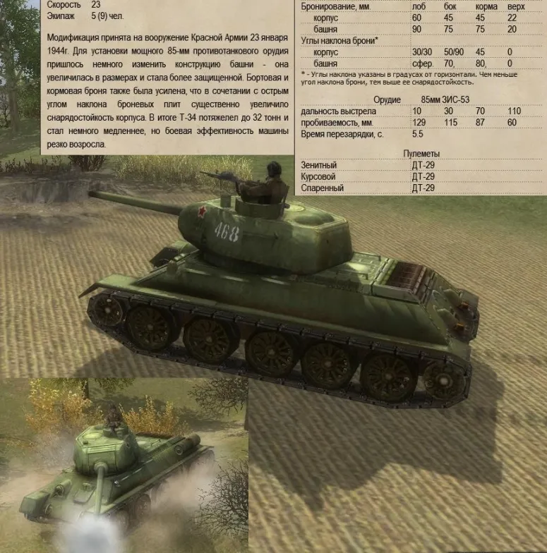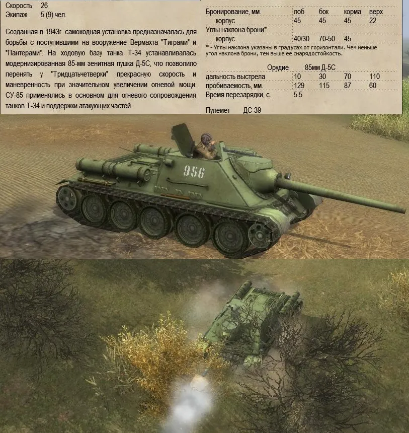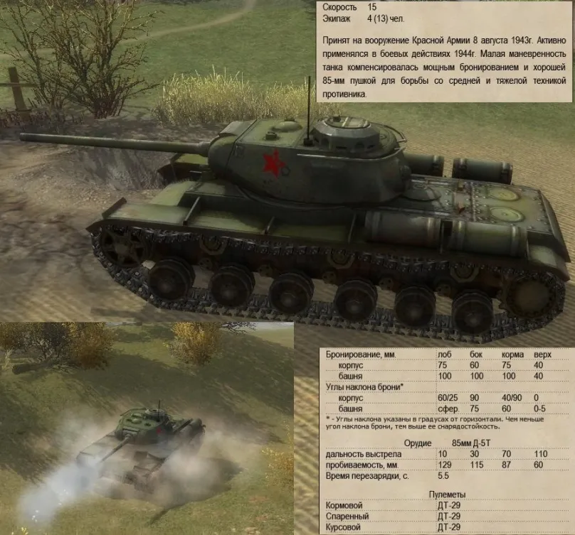 Данный танк отличается невысокой скоростью и хорошей 85-миллиметровой пушкой. Чаще всего используется для того, чтобы держать оборону, отстреливая издалека танки противника. Не предназначен для быстрых прорывов. Достаточно хорошее бронирование корпуса позволяет игроку чувствовать себя достаточно уверенно, однако недостатком является не самое удачное расположение бронелистов, что при "правильном" попадании даже не из самого мощного орудия способно погубить машину. Бортовая броня - вертикальная, поэтому машина очень уязвима при обходе с фланга. Башня поворачивается быстро, что позволяет лучше защитить машину, если она окажется без траков. Отсутствие пулеметчика на башне существенно сокращает обзор, поэтому имеется необходимость в подсветке целей и прикрытии танка. В качестве плюса стоит отметить хорошее действие фугасного снаряда, что позволяет эффективно бороться с пехотой и огневыми точками противника. Дальность стрельбы - 110 метров