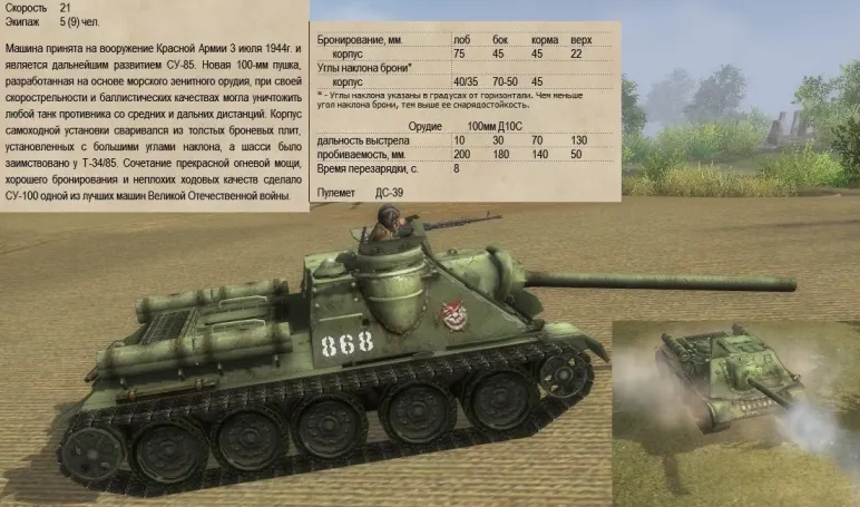 Одна из лучших САУ в игре по соотношению показателей цена/качество. Быстрая, маневренная, обладает отличной 85-миллиметровой пушкой, которая позволяет с успехом бороться и с техникой, и с пехотой противника. Недостатком является то, что это самоходка - при сбитых гусеницах она превращается в стационарную огневую точку с очень узким сектором обстрела. Установленный на рубке пулемет позволяет обнаружить и убить вражеских пехотинцев, не отвлекая главное орудие от бронетехники противника.