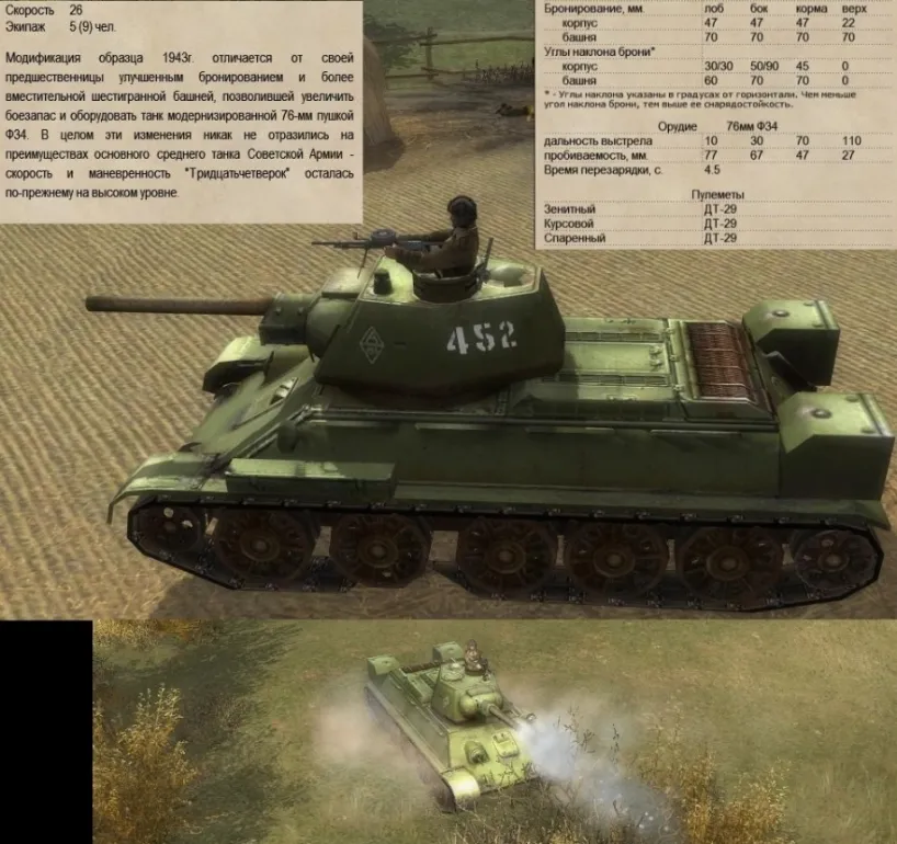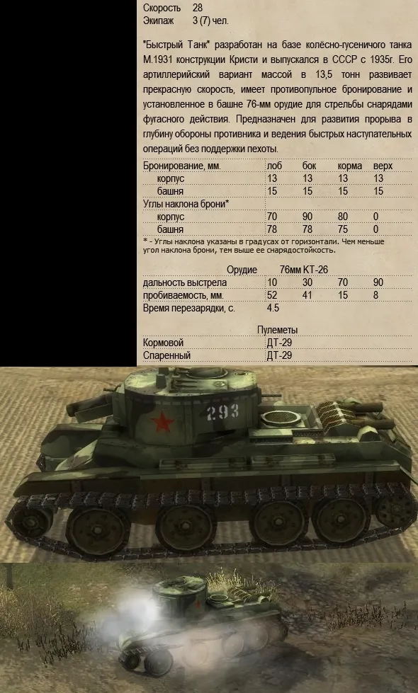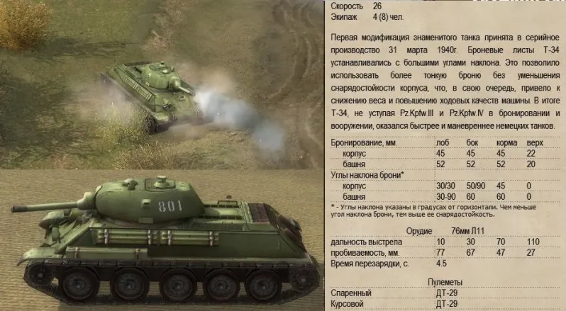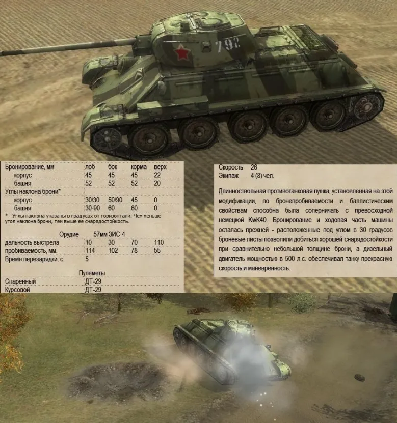 Этот танк обладает высокой скоростью и маневренностью, хотя и уступает по этим показателям Т-34/57. Мощная пушка позволяет бороться с любыми танками противника на средних и дальних дистанциях. Установленный на башне пулемет значительно увеличивает обзор. Хорошее действие фугасного снаряда позволяет с успехом бороться с пехотой и стационарными орудиями противника. При поломке элементов ремонт не занимает много времени. По отношению показателей цена/качество танк является одним из лучших в игре и чаще всего применяется во всех видах боев. Дальность стрельбы - 110 метров.