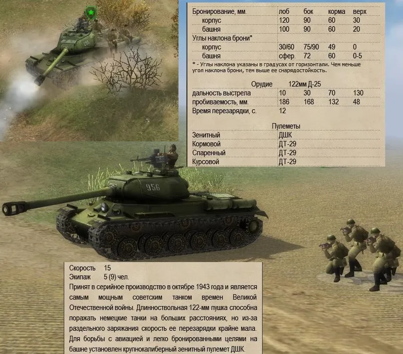 Тяжелый танк ИС-2 является самым мощным танком на стороне СССР. Обладая прекрасным бронированием и мощной пушкой с хорошей баллистикой, он стал настоящей грозой для вражеской бронетехники. Установленный на башне крупнокалиберный пулемет ДШК с успехом может использоваться для защиты танка от наступающей бронетехники, сбивая ей гусеницы, или для уничтожения наступающей или обороняющейся пехоты. Дальность стрельбы пулемета ДШК - 70 метров. Главное орудие обладает высоким показателем бронебойности. Необходимо также отметить отличное действие фугасного снаряда, который по своим характеристикам приближается к фугасам, выпущенным с гаубиц. Этот вид снаряда может использоваться против бронетехники, находящейся на значительном расстоянии, или против пехоты и стационарных орудий. Основным недостатком является малая скорость перезарядки. В бою танк необходимо держать под прикрытием более скорострельной бронетехники, чтобы исключить возможность прорыва со стороны техники противника, которые могут обездвижить ИС-2. Оставшись без гусениц, танк превращается в достаточно легкую мишень из-за медленного поворота башни. Ремонт занимает относительно много времени, поэтому зачастую игроки подбирают дополнительные ремкомплекты из находящихся поблизости разбитых танков, что позволяет одновременно чинить несколько элементов. При интенсивном ведении боя боезапаса хватает примерно на 15 минут, поэтому нередки случаи, когда ИСа-долгожителя приходится дозаряжать, вследствие этого приходится следить за количеством снарядов и горючего в машине. Во время сражения следует постоянно маневрировать, дабы избежать попадания в траки. Танк обладает невысокой скоростью и маневренностью, поэтому не рекомендуется использовать его в первых рядах атаки. Дальность стрельбы - 130 метров. В качестве плюса стоит отметить низкий профиль корпуса танка, что затрудняет попадание по нему в лоб, сферическая форма башни заставляет рикошетить прилетающие снаряды; минус - длина корпуса, что делает танк легкой мишенью при атаке с фланга, башня сбоку также достаточно уязвима. Вместе с танком дается 4 автоматчика, вооруженных ППШ (171 патрон), гранатой Ф1 и имеющих в своем инвентаре 2 бинта. Данные юниты могут использоваться для подсветки целей для танка и исключения внезапного прорыва с фланга, если их расположить поблизости от машины, или при необходимости могут заменить погибших членов экипажа, так как данный танк наиболее эффективен при полной загрузке команды.