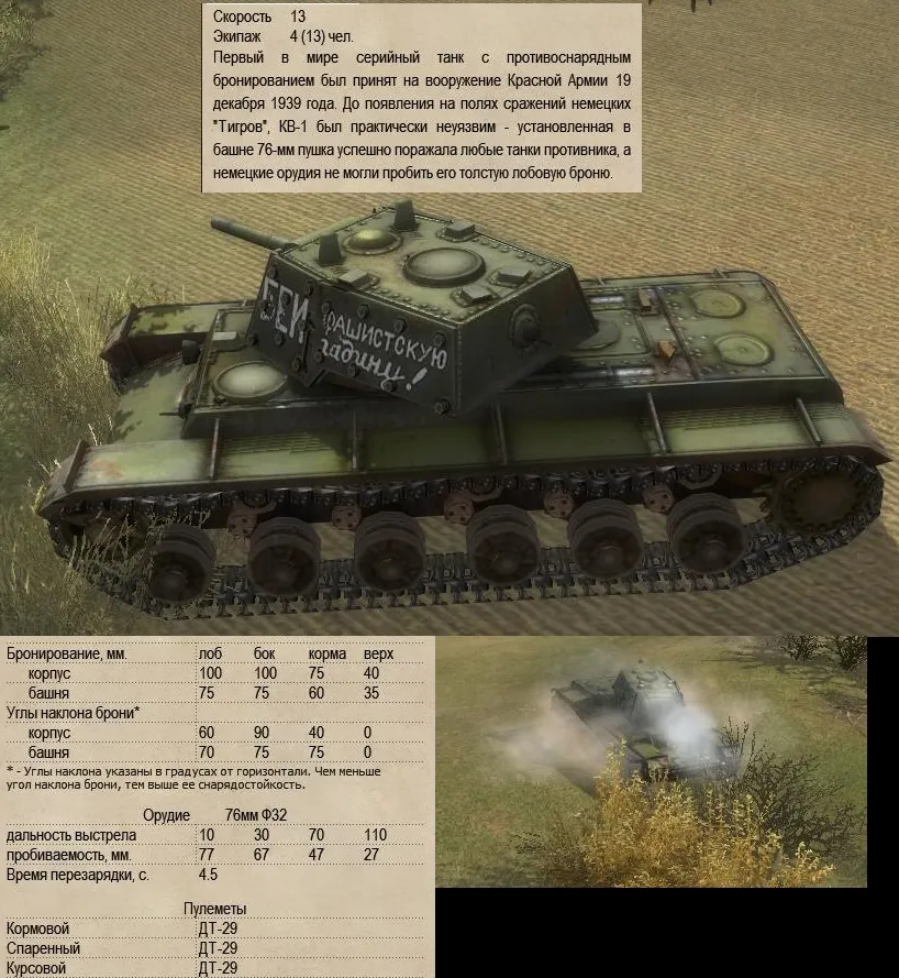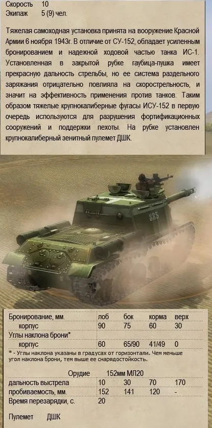 Одно из лучших дальнобойный самоходных орудий, представленных в игре. Обладает прекрасной 152-миллиметровой гаубицей с хорошей точностью на больших дистанциях, расположенной за толстой противоснарядной броней, что защищает экипаж от противопехотных гранат (в отличие от САУ Hummel или M7 Priest) и осколков (SiG33). На корпусе установлен крупнокалиберный пулемет ДШК, позволяющий эффективно бороться с пехотой, а также сбивать гусеницы танкам и даже поражать слабобронированные цели. Очень мощное действие фугасного снаряда (с нескольких раз в лоб можно уничтожить Королевский Тигр). При игре этой машиной следует располагать ее за возвышениями, дабы уберечь от огня мощных противотанковых и танковых орудий. Максимальная точность стрельбы - на дистанциях до 110 метров. На больших расстояниях разброс увеличивается, но все равно огонь ведется достаточно прицельно. В качестве недостатков необходимо также отметить отсутствие курсового пулемета, крайне малую скорость передвижения и перезарядки и небольшой боезапас, который при интенсивном использовании расходуется за несколько минут. В игре возможно использовать только одну самоходную гаубицу, поэтому есть необходимость выбирать между КВ-2 и ИСУ-152. Максимальная дальность стрельбы - 170 метров. Время перезарядки - 20 секунд.