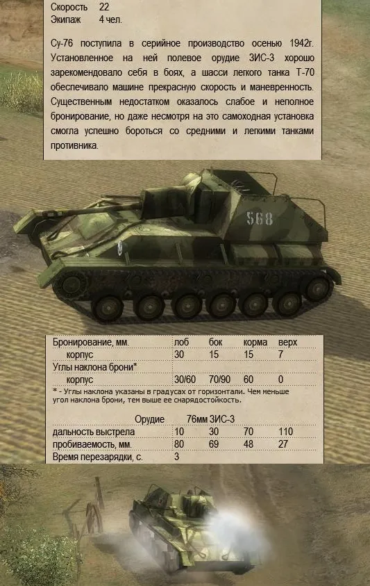 Очень шустрая самоходка. Обладает очень слабым, и к тому же неполным бронированием, что существенно снижает варианты для ее применения. Оптимальным вариантом ее использования является "выпрыгивание из тумана" аля "черт из табакерки", удар в борт и быстрое отступление. Высокая скорость перезарядки позволяет нанести несколько выстрелов прежде, чем танк врага успеет повернуть башню. В принципе в игре нет такого танка, который смог бы выдержать несколько попаданий из СУ-76 в бортовую часть. 76-миллиметровая пушка с успехом позволяет бороться и с пехотой врага, и с огневыми точками. Недостатком также является отсутствие пулемета. Детали самоходки чинятся достаточно быстро, поэтому сбитые траки ей не так страшны. Максимальная дальность стрельбы - 110 метров.