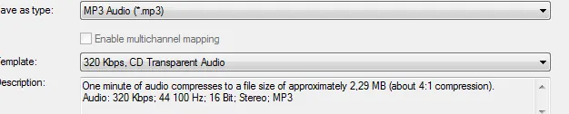 7) Выберите .mp3 формат, выставите такие же настройки как на скриншоте и сохраните music.mp3 в C:x264