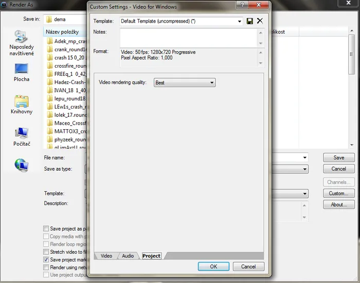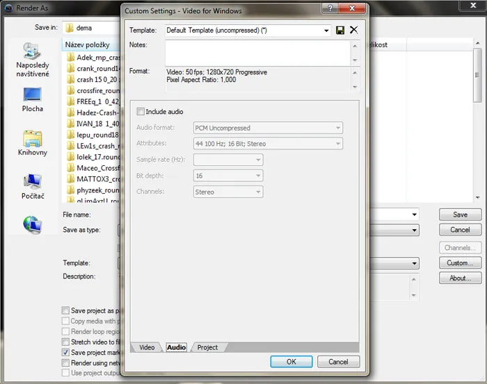 3) Запустите Vegas, выберите часть видео и поставьте render .Avi; выберите Default Template (шаблон по умолчанию). Обработка происходит без сжатия, следовательно вы можете оставить момент не сжатым или можете поставить lagarith/huffyuv кодек.