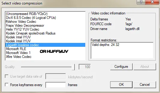 Теперь вам нужно правильно установить настройки видео. Нажмите Video - Compression и выберите: huffyuv или lagarith кодек (я использую W7 x64 и huffyuv не работает с ней, поэтому я выбираю lagarith)