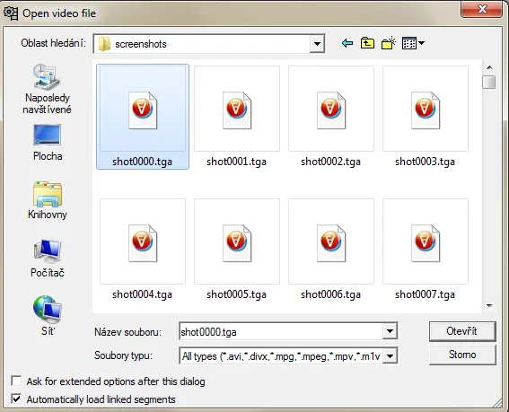 Откройте Virtual dub -> Open, и здесь вы найдете свою папку со скриншотами. Кликните на первом скриншоте, и убедитесь, что у вас отмечено: "Automatically load linked segments", затем нажмите open.
