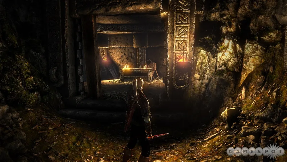 В принципе, всё дело решил магический щит. Управляли мы печально известным ведьмаком в стиле «махать мечом и сломя голову рваться в бой». Поэтому цель из нас получилась довольно лёгкая, но, когда наши враги атаковали, они получали удар током от нашего щита, что, в большинстве случаев, просто вырубало их на месте. Оставив за собой ещё одну гору трупов (чего потом удивляться, что Геральта боятся), мы наконец добрались до каменистого склона горы со входом в склеп, о котором ранее говорил эльф-наниматель. Тут один из сотрудников «CD Projekt Red» тоненьким двухметровым намёком сообщил, что для следующего боя было бы клёво сменить необычный стальной меч на няшный серебряный. В старом пыльном склепе мы обнаружили все классические атрибуты подземелья: старые мосты, обгорелые факелы и потрескавшиеся стены, просто умолявшие сломать их. Взяв на изготовку старое-доброе заклинание огненного шара, ломающее стены, мы пробились в склеп, не особо тревожась за сохранность архитектурного ансамбля усыпальницы.