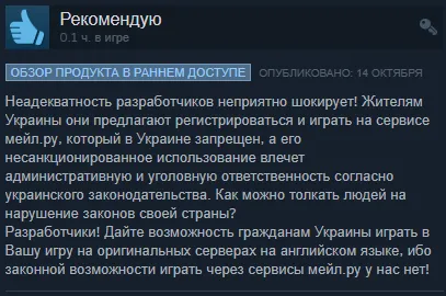 Речь идет как раз о том, что было упомянуто вначале статьи. Steam-версия для пользователей из СНГ не доступна. Всех их направляют регистрироваться и играть, используя сервисы Mail.Ru. Пользователи Украины, которые все же соглашаются на такую авантюру, оказываются в тупике из-за санкций и любуются окном ошибки:
