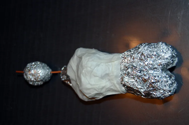 Так начинается скелет. Делать "основу" лучше всегда меньше, чем будет заданная часть тела в итоге, потому что печальный опыт показал, что слой пластики должен быть толще, чтобы не рваться при кипячении. И делать основу лучше максимально приближенной по анатомическим формам. Потому как, в идеале, фигурка должна быть внутри полой, хотя это критически важно только для шарнирной куклы (кстати, следующей я буду делать Сону на шарнирах). Малярным скотчем я фольгу заклеила, чтобы лучше было сцепление с пластиком и чтобы после термообработки было легче выковырять "набивку". Но впоследствии слегка подзабила.