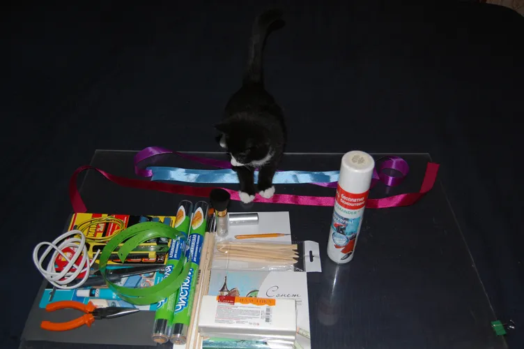 Все, что надо для начала работы - это пластика, стеки, проволока, нож, ножницы, шило, плоскогубцы, фольга, клей для пластиков, эпоксилин, пастельные мелки (ради бога, не повторяйте моих ошибок, не берите масляную. Я очень сильно с этим лоханулась), акриловые краски (на фото отсутствуют, были куплены позже), лак для покрытия (аналогично), кисти разнокалиберные, ленточки атласные - на волосы, бумага с карандашом, малярный скотч, что угодно на роль скалки (в моем случае это был баллон со средством для ухода за обувью), а также верный помощник, который не даст ни на секунду сосредоточиться.