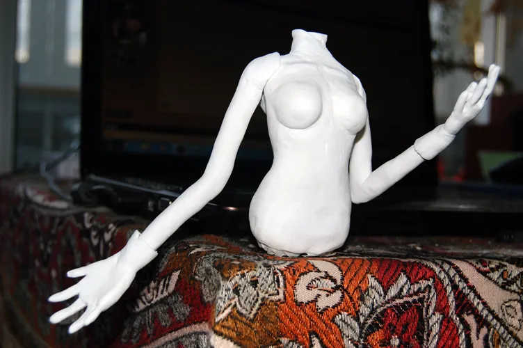 Потом появилось туловище. Я, правда, несколько лоханулась (снова) с шеей, плохо продумав, как я буду крепить к ней голову. И слегка пожадничала пластики на сисьгрудь.