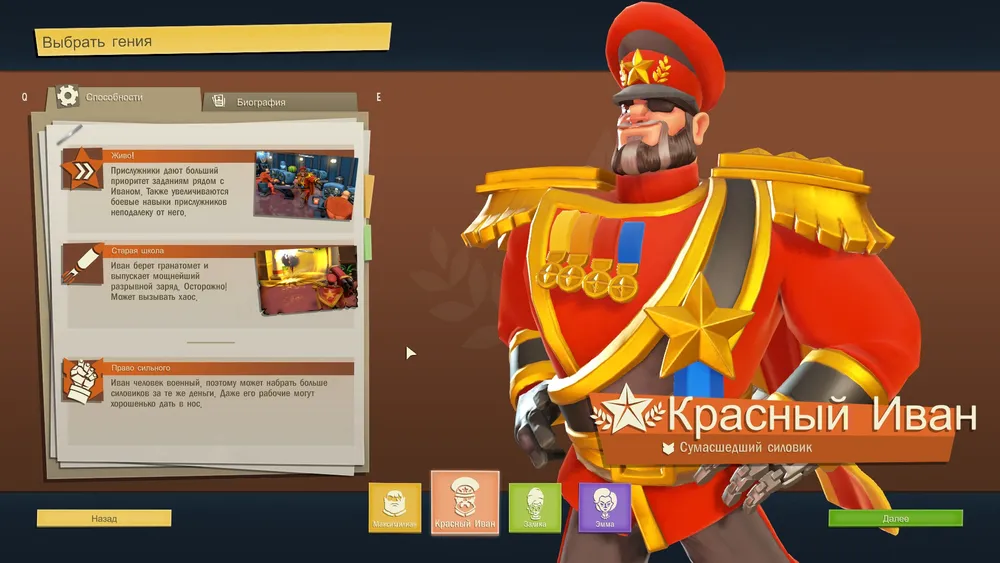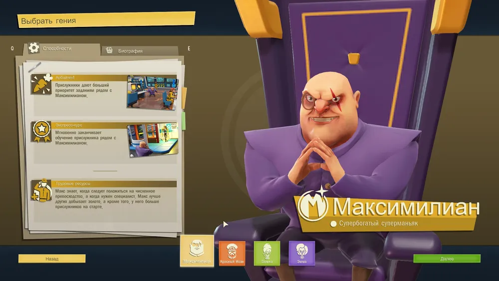 После этого игрок получает свой остров, на котором предстоит обустраивать логово злодея. Мне кажется, что Максимилиан самый удобный для знакомства с игрой персонаж, так как у него есть бонус к зарабатываемому золоту. Зато остальные злые гении имеют любопытные способности с уклоном в ту или иную специализацию, что может сделать игру более интересной с точки зрения построения тактики.