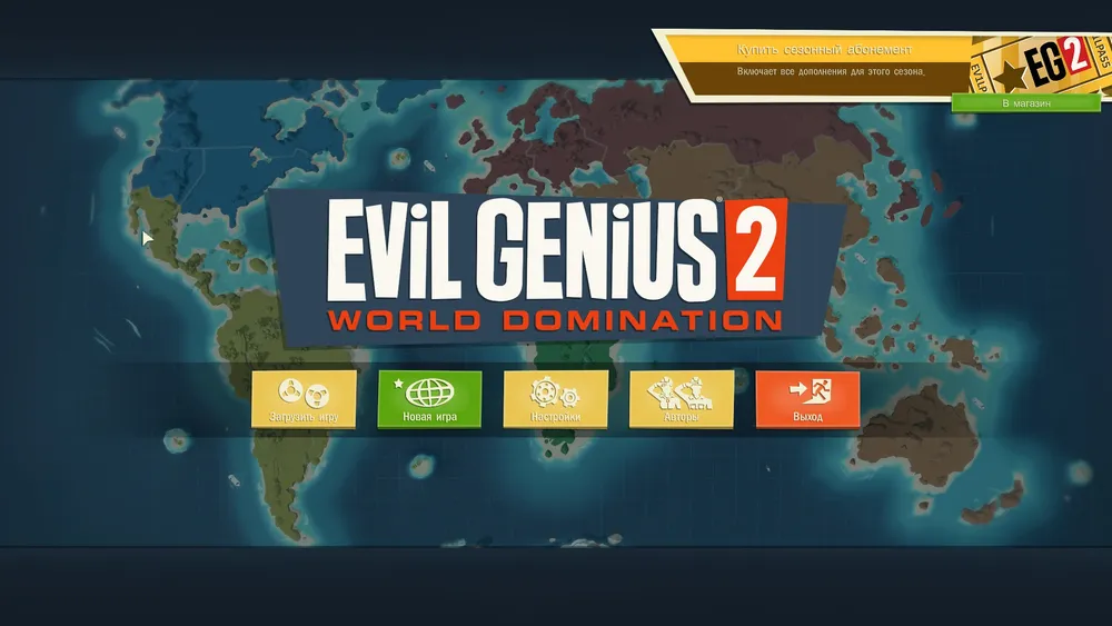 Главное меню встречает нас выбором режима игры. В "песочнице" будут доступны все функции сразу, однако там не засчитывают достижения Steam. Кампанию можно начать либо выбрав по-умолчанию быстрый запуск игры на средней сложности за Максимилиана, либо выбрать другого злого гения и сложность.
