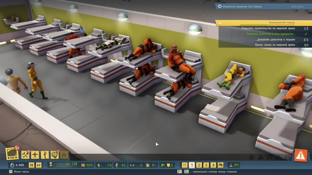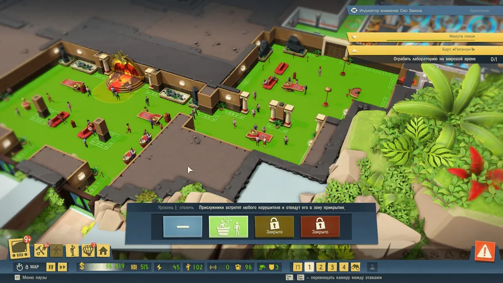 Со временем можно собрать целую ораву миньонов — до 300 человек. Для их найма нужны не только деньги, но и покупка шкафчиков с личными вещами в казармах. Отслеживать потребности и настроение прислужников поможет соответствующий раздел из меню статистики.