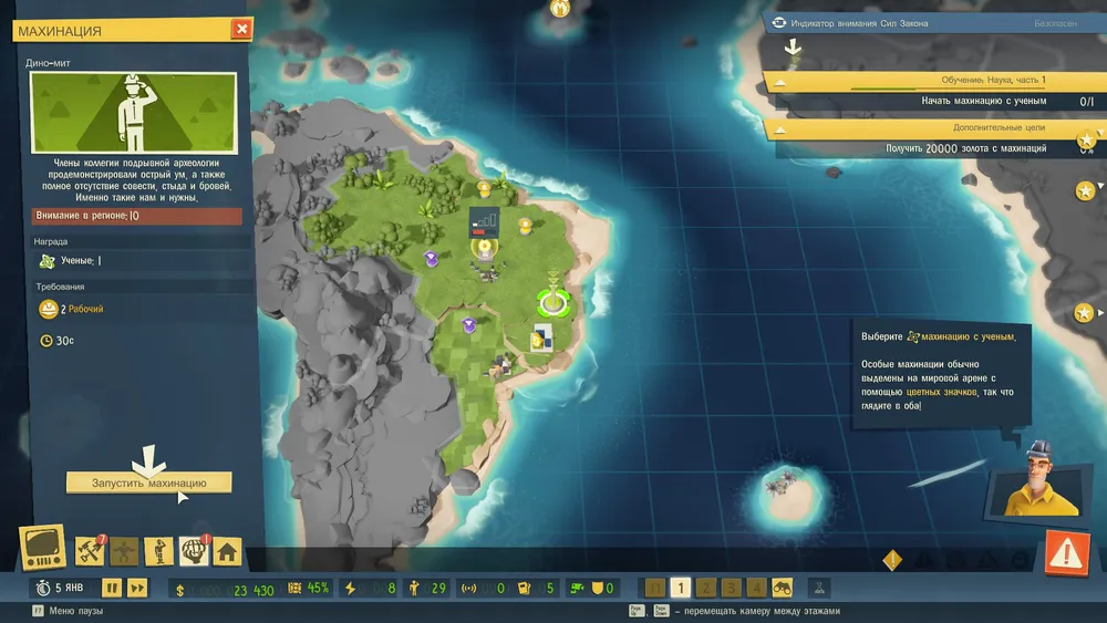 В Evil Genius 2 подобие кампании устроено так, что все миссии идут одним потоком, а задачи будут сменять друг друга. Сначала предстоит пройти затяжной режим обучения: каждый урок по постройке нового помещения будет открывать следующие типы построек и покупок. Игроку покажут, что для работы помещений нужны электростанции, для наших миньонов надо строить казармы с кроватями для отдыха и столовые для кормёжки; золото будет храниться в сокровищницах пока ещё прямо на поддонах: сейфы надо исследовать в лаборатории и тогда можно будет ставить их. Для захвата мира потребуется центр управления, в котором мы установим различное оборудование: ретрансляторы, компьютеры обработки данных, экран наблюдения и прочее. Тогда станет открыта карта мира. Политический глобус поделен на пять зон, каждую из которых контролирует (защищает от нашего злого гения) своя организация супер-агентов: Патриот, Меч, Горн, Удар, Молот. С нашей базы мы будем выбирать какую-то территорию и открывать там свою преступную ячейку (создавая тем самым преступную сеть). После чего можно будет устраивать махинации (логично, что злодейские операции надо назвать так). Махинации помогают зарабатывать деньги, а также выполнять ключевые для сюжета задания вроде похищения ученых и политиков. К сожалению, разницы между махинациями почти нет: мы платим за выполнение задания возможной потерей своих миньонов при выполнении задания и привлекаем внимание организации супер-агентов к региону. Превышение подозрительности заблокирует возможность запускать новые махинации на какое-то время. И тут на выручку приходит полезный тип махинаций, которые снижают подозрительность.