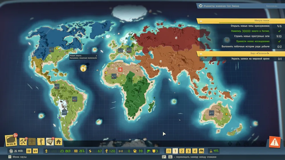 Игровые события протекают одновременно и на карте мира и на базе, поэтому можно случайно проморгать какое-то происшествие, разглядывая карту или планируя новую постройку. Впрочем, обо всех событиях выводят уведомления на бегущей строке внизу экрана, а также отмечают их значками в правом нижнем углу. Нажав такой значок мы увидим сводку всех событий, например, список миньонов ставших дезертирами. Наконец, чтобы не утонуть в этом потоке происшествий можно поставить игру на паузу и отдать распоряжение. Когда рабочий ритм в логове ничто не тревожит в самый раз будет включить ускорение времени: так не придётся долго ждать завершения исследований или махинаций.