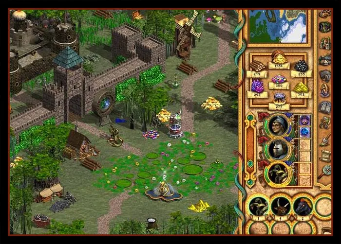 Карта приключений тоже претерпела некоторые изменения. Отныне она была окутана туманом войны, а это означало, что враг втихаря мог подкрасться к нам и ударить из-за угла. Кое-что, впрочем, не изменилось. Нас все так же ждало множество мест, которые мы могли посетить, куча артефактов, которые можно было утащить, ресурсы, шахты, генераторы существ и алтари. Однако если звучит это навскидку интересно, визуализация этой самой карты серьезно подкачала, и четверка утратила то, чем славились третьи "Герои" - наглядность. Схожая участь ждала и замки: осады, такие понятные раньше, превратились в долгие маневры с выламыванием ворот, обстрелом башен и прочими ухищрениями.