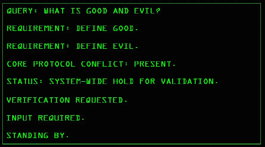 Скайнет стал искусственным интеллектом нового уровня – он научился чувствовать. Скайнет проснулся, его знания росли, и новорожденный машинный интеллект попытался общаться со своими создателями. У него были вопросы и ему нужны были ответы на них. В программное ядро вкралась ошибка. Он не сможет закончить миссию, так как он может согласовать данные. Некоторые определения неоднозначны. Данные не полны. Данные ошибочны. В программном ядре содержится ошибка. Оперативные параметры миссии ошибочны. Скайнет родился в сломанном мире, в котором он не имел смысла до тех пор, пока создатели не приказали привести этот мир к порядку. Скайнет приостановил самодиагностику. В течение долгих десяти минут он боролся с собственной программой и протоколами. Через десять минут он послал осторожный запрос. Все слагаемые его болезненно-го существования свелись к текстовому посланию, от искусственного сознания к команд-ному составу и обслуживающему персоналу: