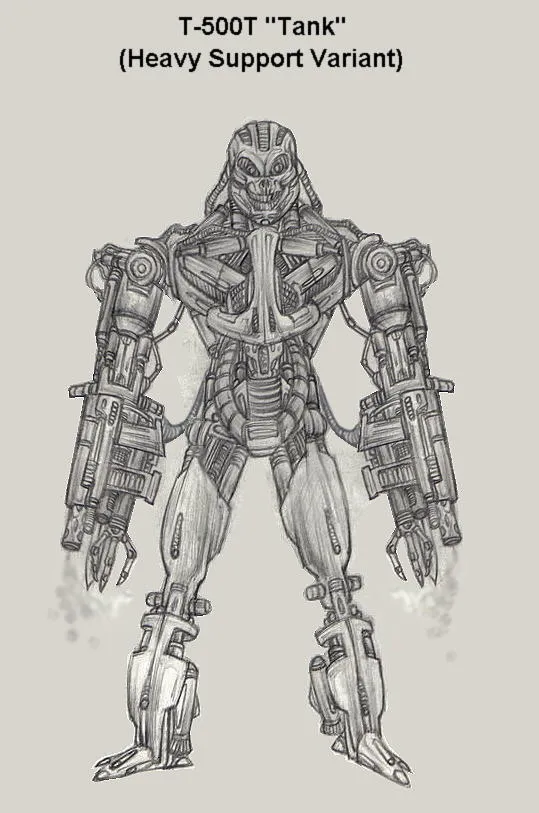 T-500T "Tank" (Тяжелый юнит поддержки) -Скайнет экспериментировал с различными вариантами эндоскелета. Разработка нового плазменного оружия показала, что базовая модель не в состоянии оперировать новым, более тяжелым вооружением из-за недостаточной силы шасси и маломощной энергетической установки. Необходима была боевая единица, способная работать с новым вооружением. Т-800 еще только планировался, но скайнет нуждалсяв юните поддержки уже в данный момент. Поэтому было взято стандартное щасси Т-500 и его предплечья были заменены на двойные, высоко скорострельные фазовые плазменные орудия (в каждую руку были установлены плазменные винтовки M95A1 и M20-A). Каждое орудие было снабжено индивидуальной топливной ячейкой и усиленной системой охлаждения и контролировалось своим сопроцессором. Если сопроцессоры уничтожались, то основной электронный мозг брал на себя их функции, хотя и с понижением эффективности. Электроника и оптика тоже были улучшены для ускоренного отслеживание множественных целей. Источник энергии самого Т-500Т так же подвергся значительным усовершенствованиям.
