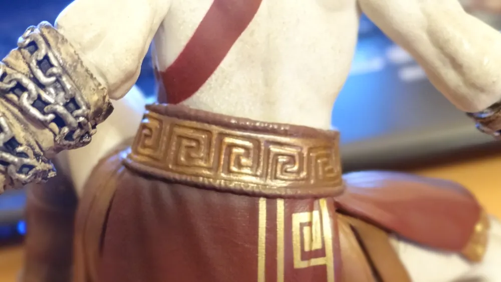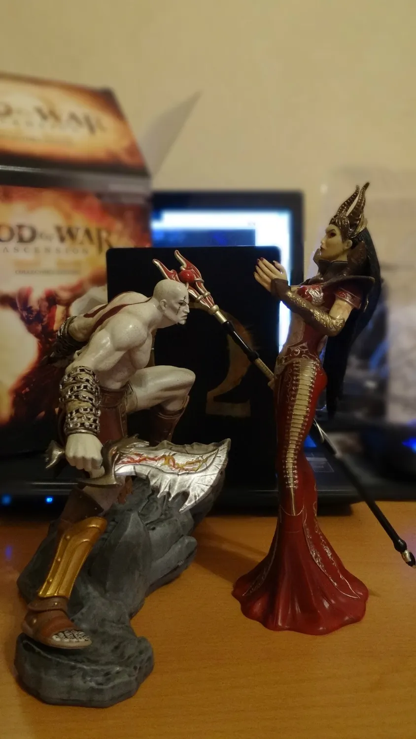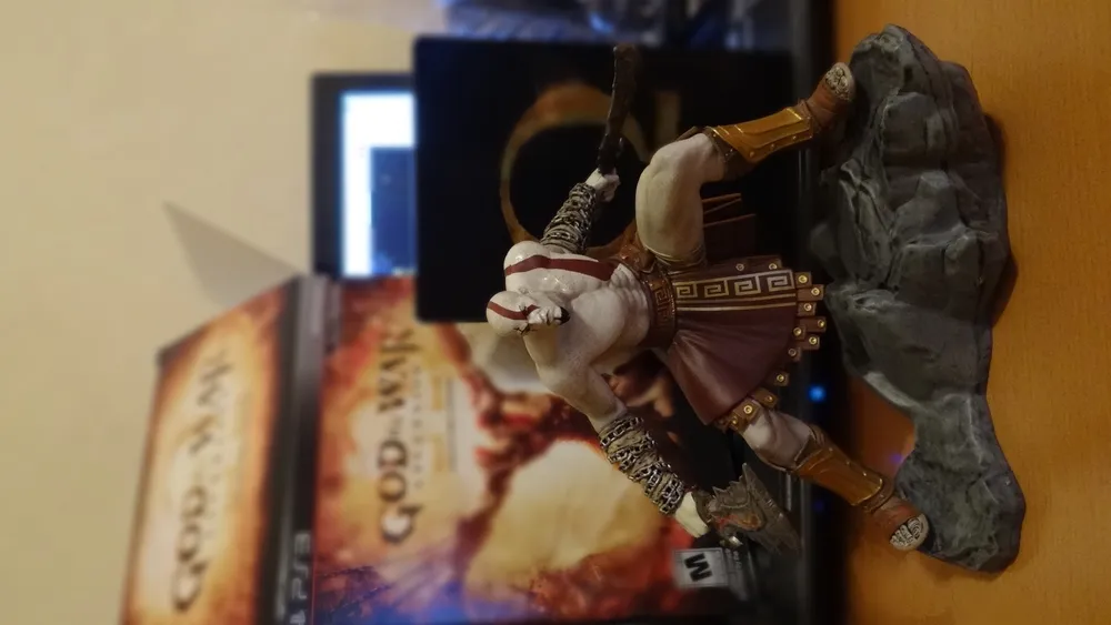 В коллекционном издании Кратос выглядит именно так и, к слову, имеет недочеты, связанные с фиксацией фигурки на подставке (паблишеры явно пожалели денег на нормальный фикс, а также материал)