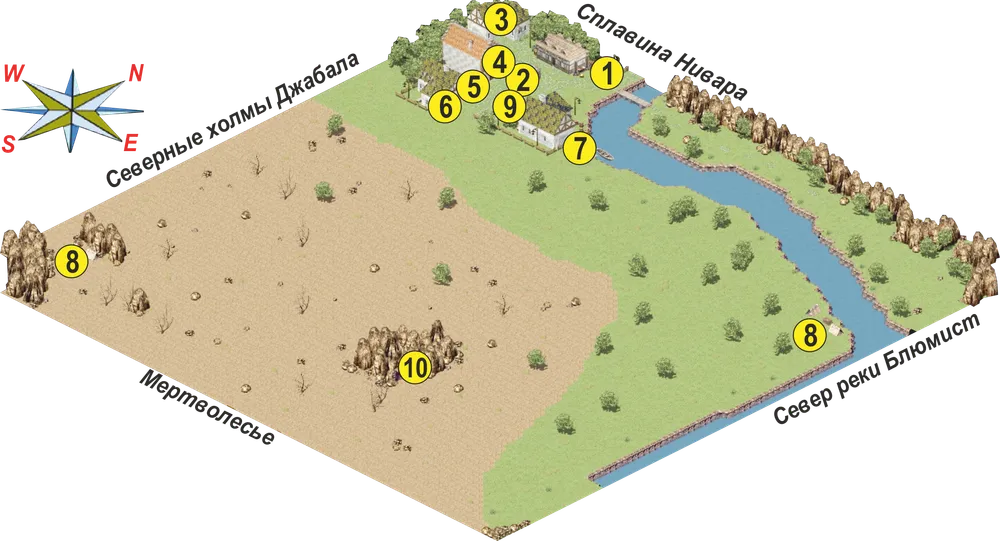 1 – брат Гудазар. 2 – капитан Теара. 3 – таверна «Роскошное блюдо». 4 – ратуша. 5 – кузнец Терена. 6 – торговец Ронус. 7 – лодочник Наррим. 8 – лагерь бандитов. 9 – Терод Ном. 10 – пещера Роната.