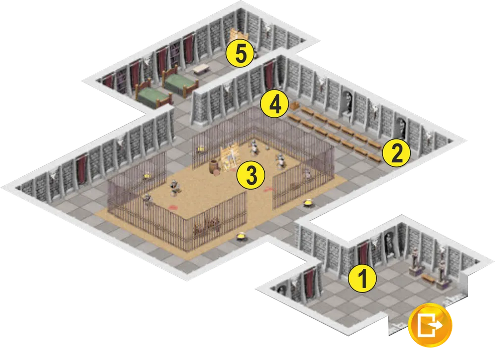 1 – привратник Тилгар. 2 – Дарема Брайтхаммер. 3 – сержан Раккус. 4 – сержант Даукар (обучает только членов гильдии). 5 – алхимик Нииса (обслуживает только членов гильдии).
