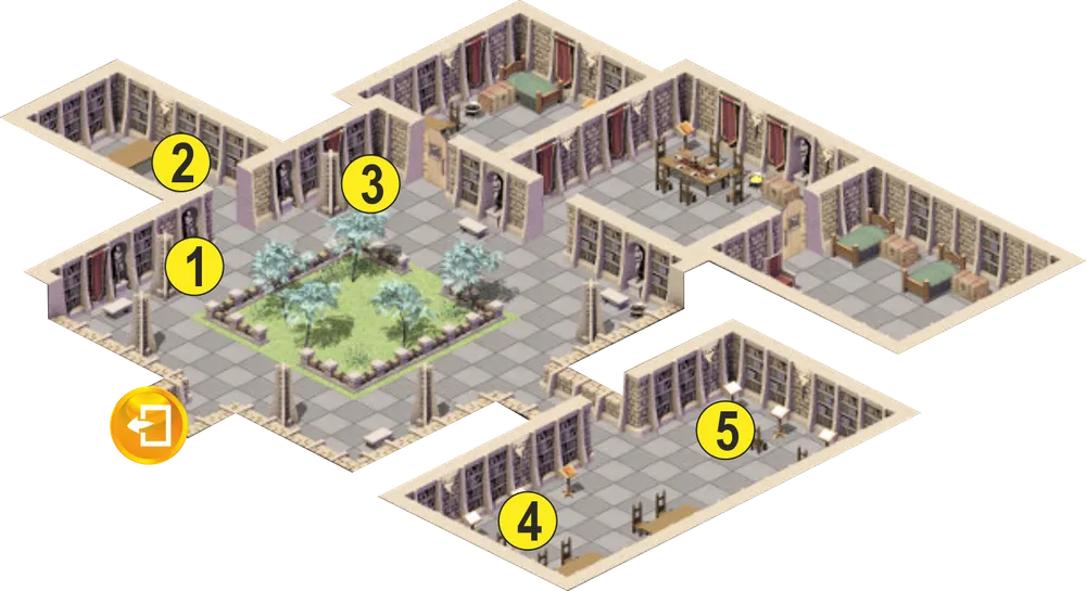 1 – тело с кольцом. 2 – секретная дверь. 3 – саркофаг (меч «Оркорез»). 4 – библиотека.